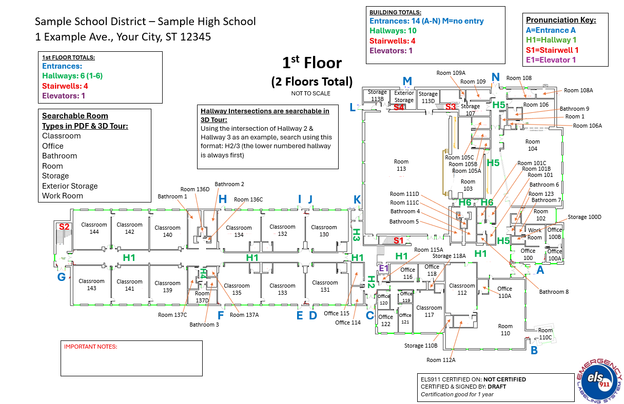 By pre-labeling rooms, hallways, stairwells, elevators/escalators, and access points with bold, standardized identifiers, ELS911:
